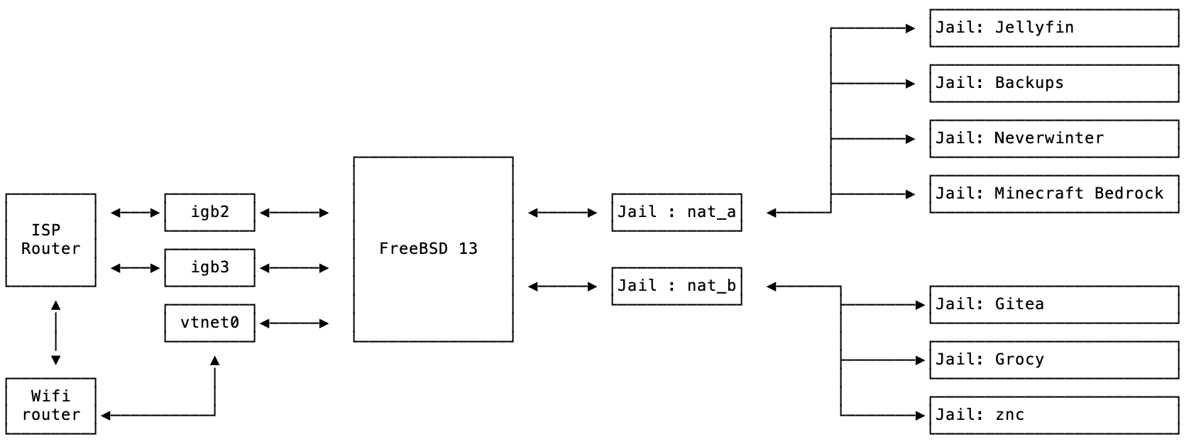 For my usecase the most interesting jails are the nat_a and nat_b jails, which are vnet jails that perform routing and nat for the other jails. To isolate the network from the host(jail 0) I use vnet to move the igb interfaces to the nat jails, the effect is that those nics won’t be available on the host (jail 0) My ISP router is on bridge mode, so each igb interface connected to it will get an ip address by dhcp, so each nat jail will have two interfaces :